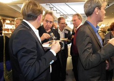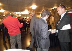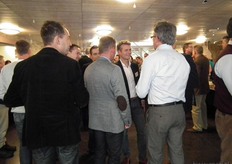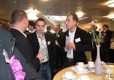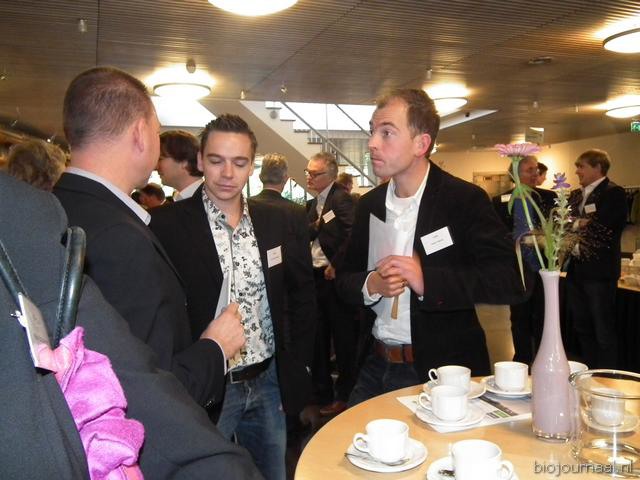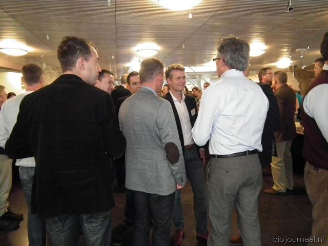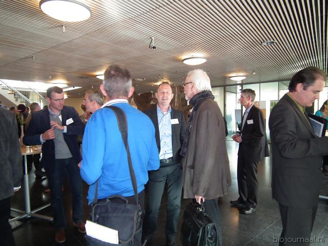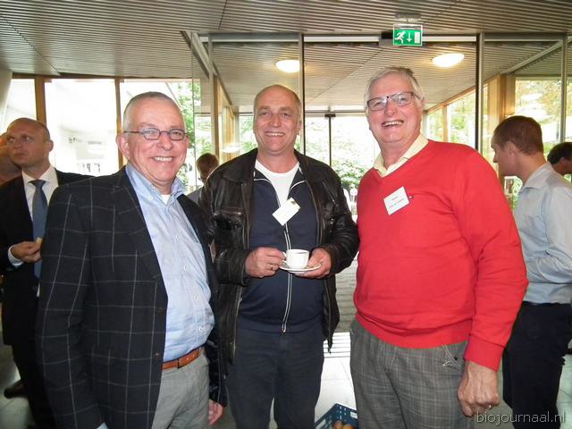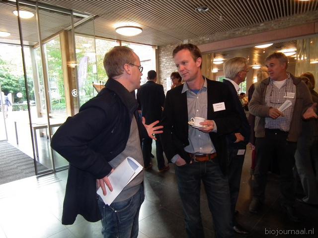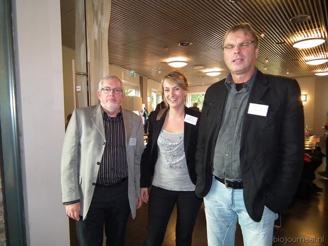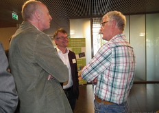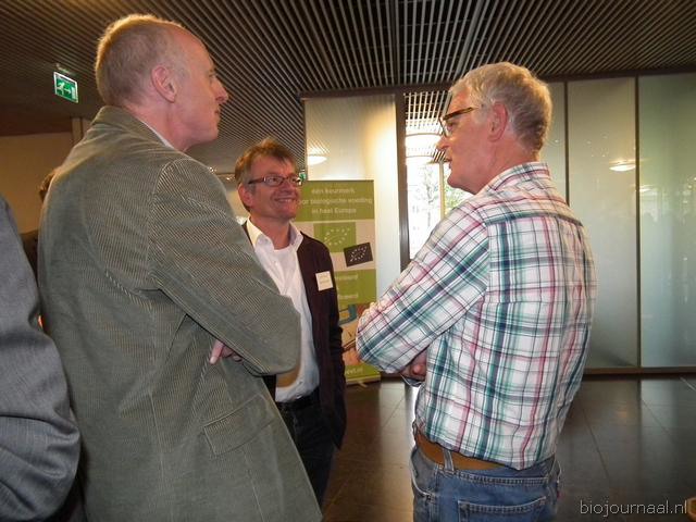 Michaël Wilde van Eosta in gesprek met Paul Fischer van Vroegop-Windig. Rechtsachter Alex van Hootegem die vanuit Kruiningen afgereisd was naar het Bio-Congres.