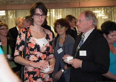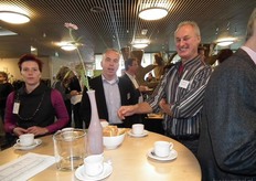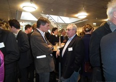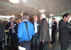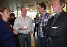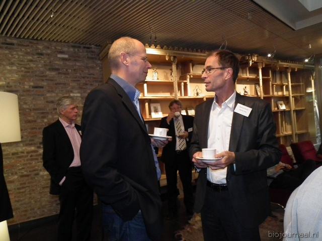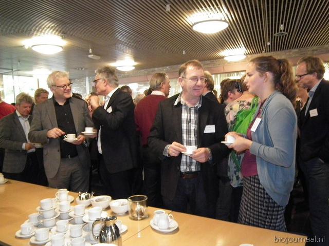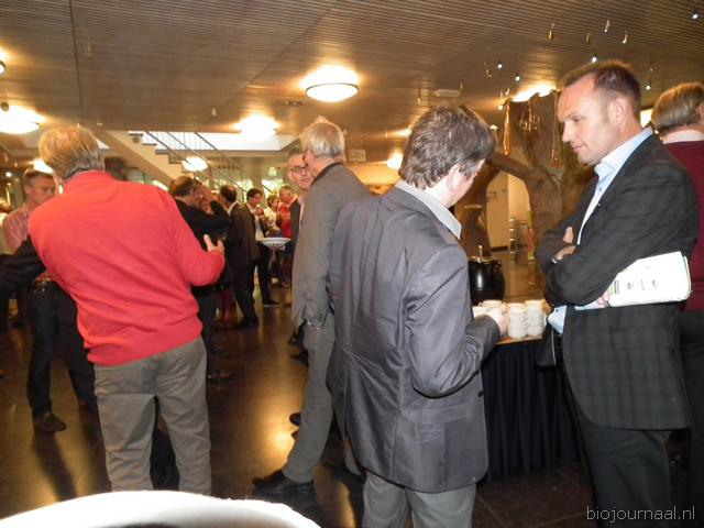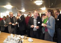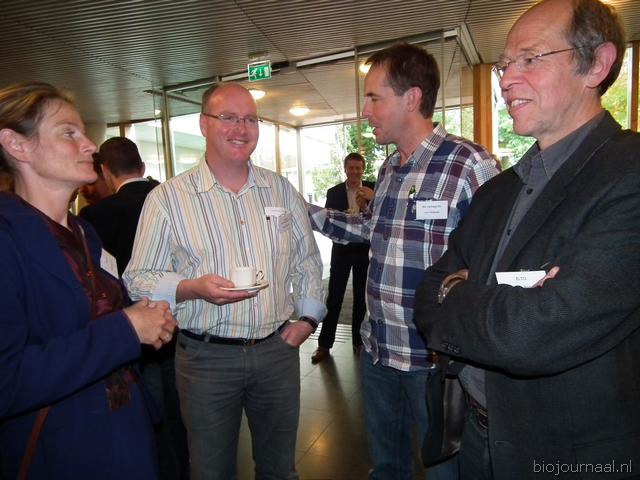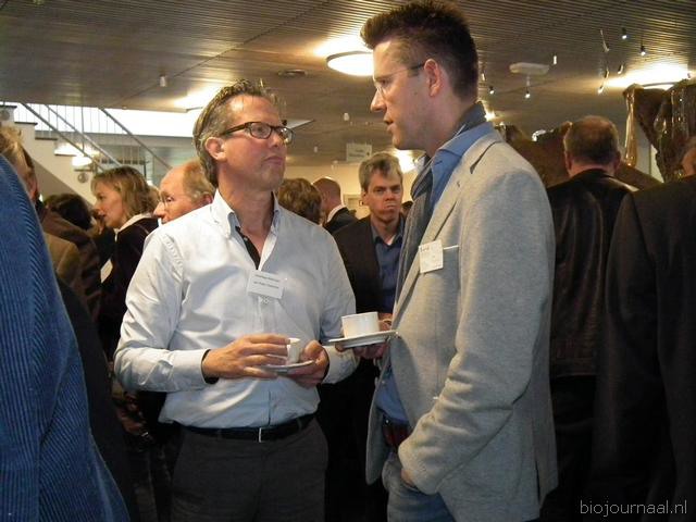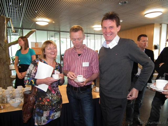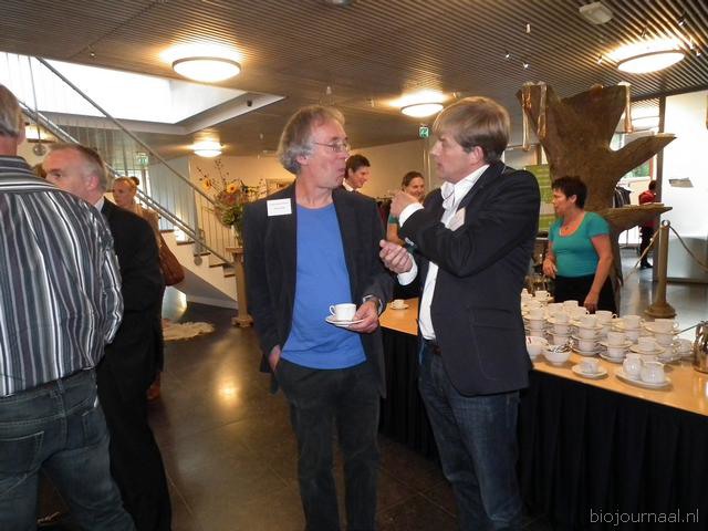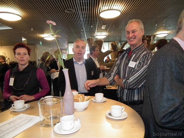 Henk Gerbers (Bio+/De Groene Weg) nuttigt een kopje koffie met Koen van der Drift. Rechts is Bart Boon in gesprek Mariken de Bruijn. Zij heeft onlangs nog wat extra taken overgenomen van Chris Maan op de communicatie-afdeling van Skal.