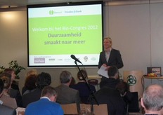 "Dagvoorzitter Menno Bentveld heet de aanwezigen welkom op het Bio-Congres. "Allemaal ten eerste van harte gefeliciteerd met Duurzaamheidsdag."