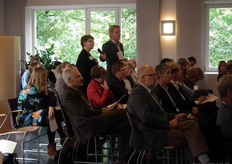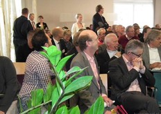 Drie rijen met stoelen. De meeste sprekers zaten rechts vooraan. Zittend rechts Bart Boon van Eco Fields, hij viel als spreker in voor John Halmans van Gulpener. John moest vanwege de gevolgen van een val met zijn mountainbike helaas afzeggen.