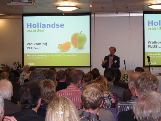 "De unitmanager vers van PLUS Retail sprak onder meer over efficiënt verduurzamingsslagen maken. Voordat hij het verwijt kreeg dat hij te weinig aandacht aan bio schonk in zijn presentatie, gaf hij aan dat in de assortimentsontwikkeling een drietal belangrijke categorieën zijn: bio, fairtrade en streekproducten. "Voor ons bio-assortiment werken we veel samen met Bio+."