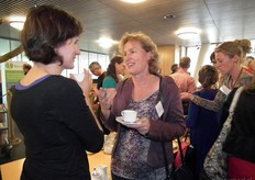 Heleen Bos van Rijk Zwaan drinkt koffie met Maaike Raaijmakers van Bionext (links).