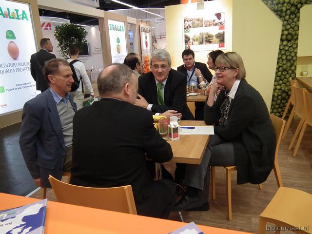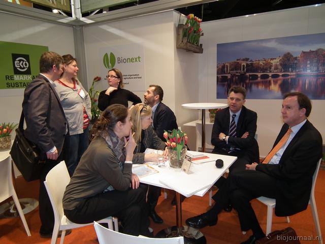 René Heusschen (Stichting EKO-keurmerk) en Paulien Veerman (Bionext) in gesprek met Monique Brobbel en Loek Hesemans van het ministerie van Economische Zaken, Landbouw en Innovatie. Aan tafel vanaf rechts Rob Zaagman en Ton van Arnhem (beiden voor het ministerie van Buitenlandse Zaken, actief in Duitsland).