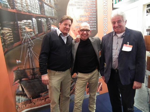 René Lips (links) en Jan Hermus (rechts) van Hermus Made brachten donderdag een bezoek aan de BioFach. Zij poseerden graag met Walter Doens (directeur Doens Food Ingredients).