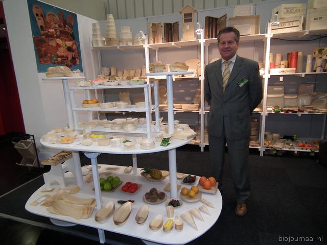 Stefan Kubicz van Denlop Natural Arts stond voor het eerst op de BioFach. In Polen worden allerlei verpakkingen geproduceerd van hout. In de stand waren onder meer kaasverpakkingen en broodbakjes te vinden.