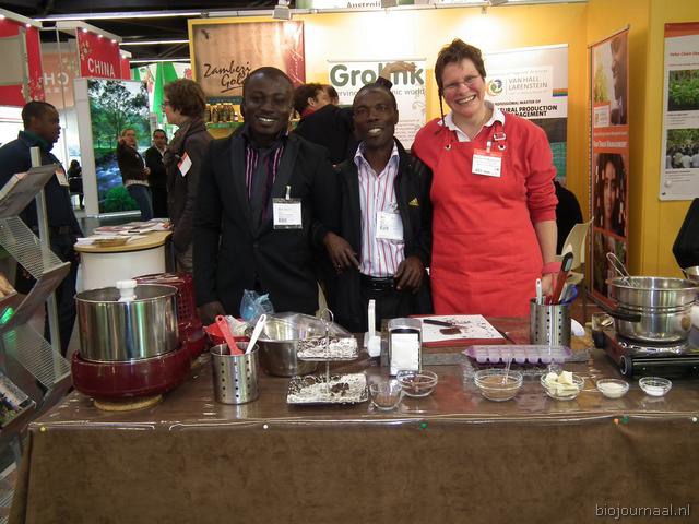 "Louis Bolk Instituut gaf ook dit jaar weer diverse Afrikaanse boeren de kans om zich op de BioFach te presenteren. Ingrid van der Maat (vrouw van Boudewijn van Elzakker) maakte chocolade. Ze staat op de foto met de Ghanezen Dennis Opong en Jacob Kornor, handelaar en teler van bio-cacao. "We tonen hier echt het verhaal van boer naar eindproduct."