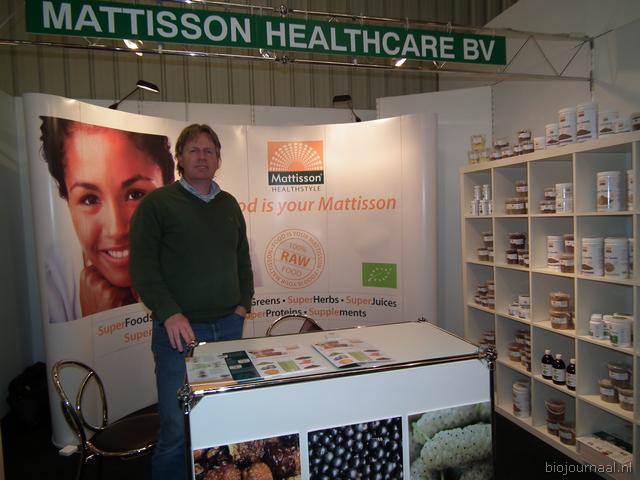 Ruud van Tol in de stand van Mattisson Healthcare. Daarin werden weer diverse raw- en superfoods gepresenteerd.