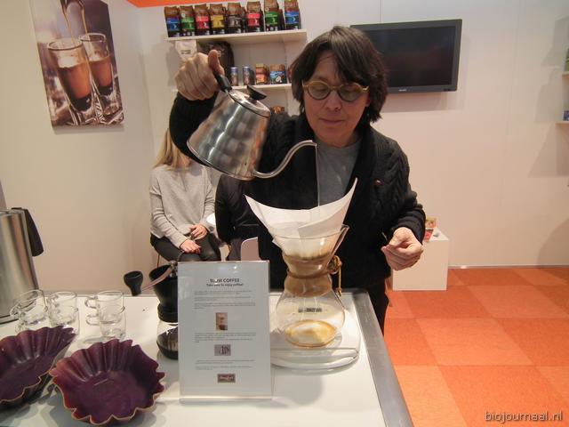 "Paula Koelemij maakte 'slow coffee' klaar voor bezoekers in de stand van Simon Lévelt. "Dit is echt de laatste trend op de specialiteitenmarkt. Met 30 gram cacao kan je een halve liter koffie zetten."