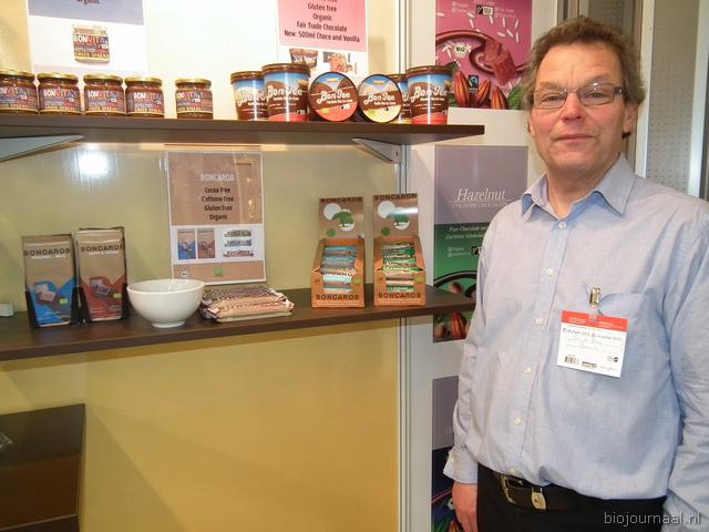 Ton de Haan van Bonvita naast wat producten van het nieuwe merk BonCarob (cacao-vrije chocolade).