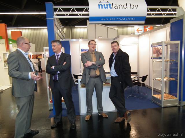 Rody van der Horst en Joost Boone van Nutland BV (twee mannen in het midden). Zij vertelden alles over het brede assortiment aan noten en gedroogde vruchten van Nutland.
