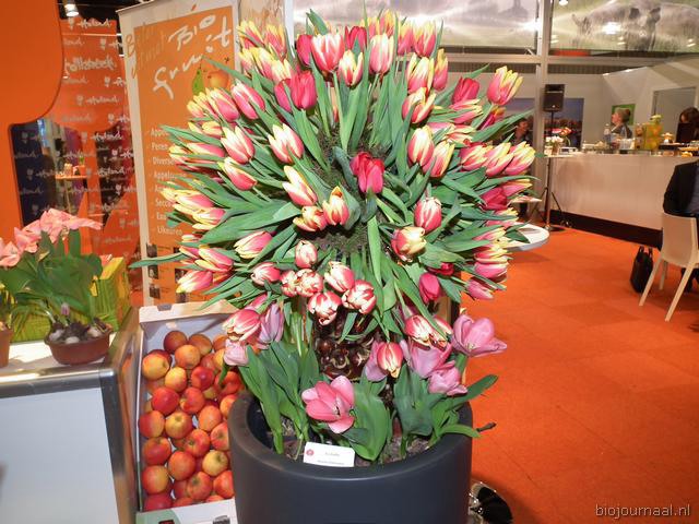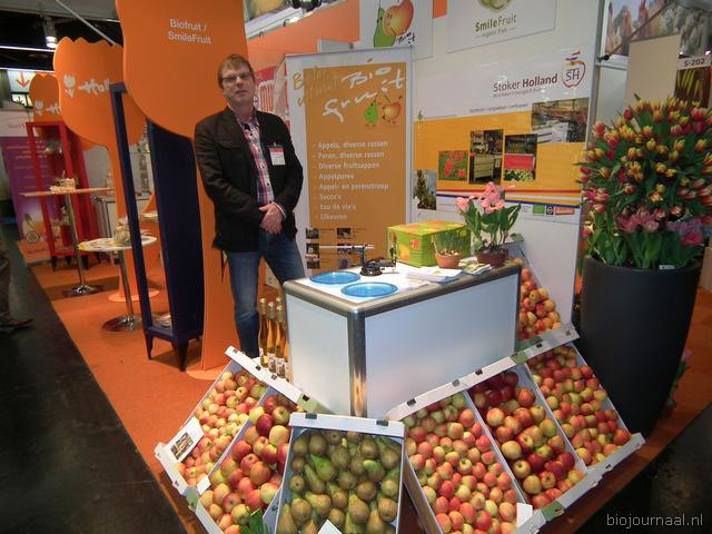 Wim Stoker alleen in de stand van Biofruit/Smilefruit. Bio-fruitteler Harmen Peters was helaas verhinderd in verband met een longontsteking.
