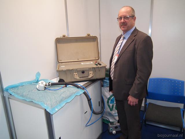 Eddy Jeldens van VacQPack toont het mobiele koffertje waarmee producten vacuüm verpakt kunnen worden.