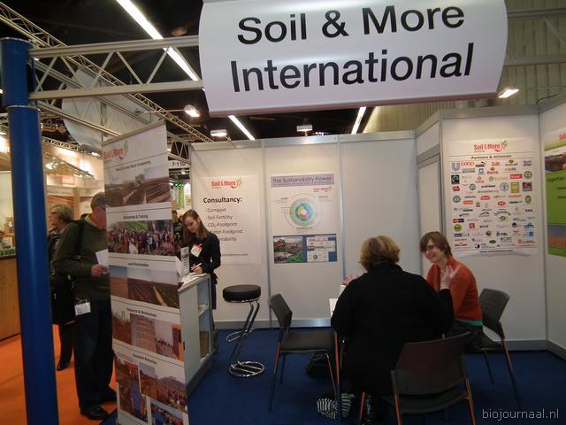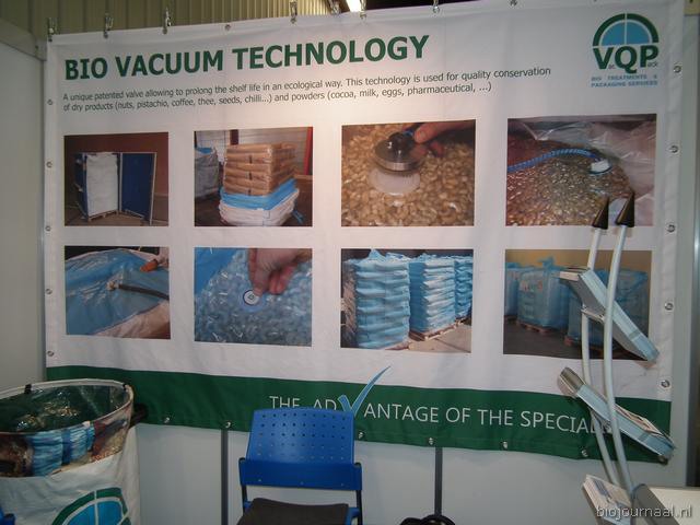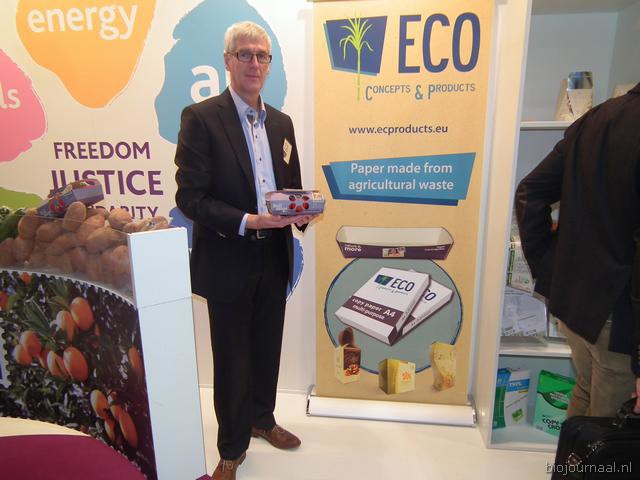 "In de stand van Eosta was ruimte gemaakt voor Peter van Rosmalen van Eco Concepts & Products. Hij maakt papier en karton gemaakt van agrarisch afval. "Het gaat erg goed, ik heb al wat mooie opdrachten binnengehaald."