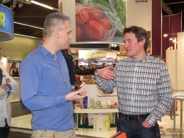 "Arnold Broek (rechts) van The Organic Factory in gesprek met Lennart Olsson. "Dit is een ideaal moment om onze ideeën voor nieuwe producten rechtstreeks met de klanten te bespreken."