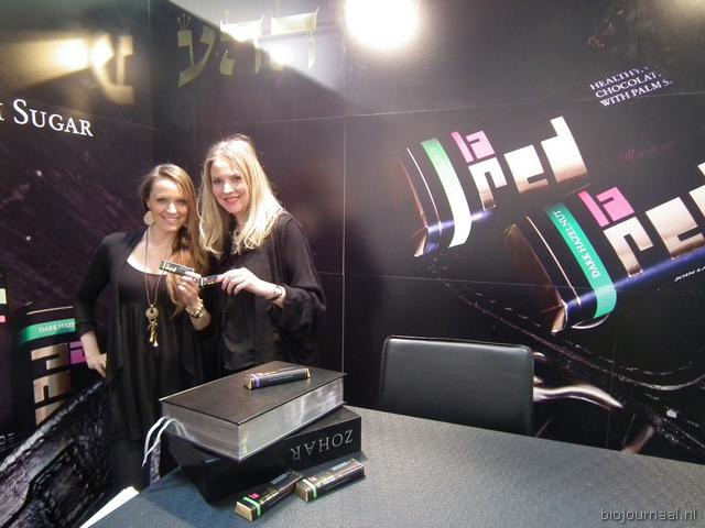 Christel Slijkerman (rechts) van La Red Food kreeg tijdens de BioFach hulp van Christine. De met rietsuiker gezoete chocoladerepen waren niet aan te slepen.