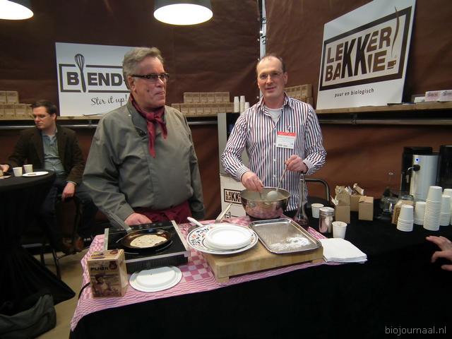 GertJan Evers (BLEND-IN, rechts) serveerde zijn Lekker Bakkie op de BioFach. Links naast hem Henk Buis. Hij is sinds kort toegetreden tot BLEND-IN, met zijn product PuurPannenkoek. Dit is een serie pannenkoekmixen met zeer bijzondere smaken als spelt/speculaas, cranberry/sinaasappel, blauwe bessen, chocolade/dessert.