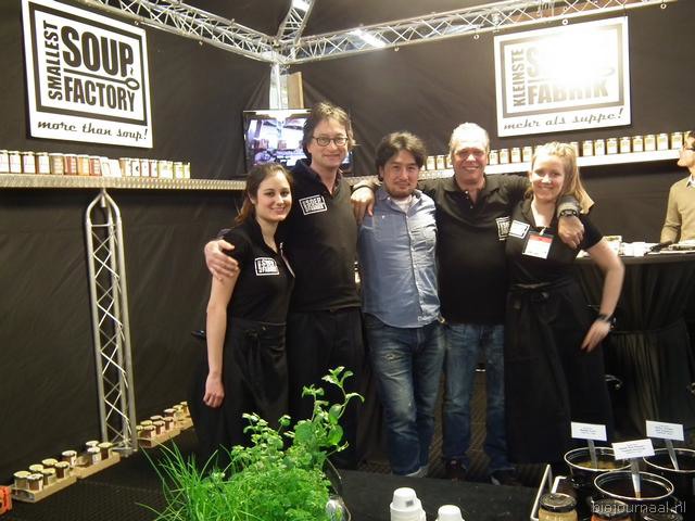 Thea Jansen, Michel Jansen, Yo Kitidate, Willem Versteeg en Louisa poseren in de stand van de KleinsteSoepFabriek.
