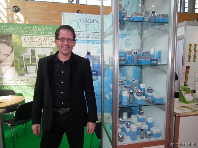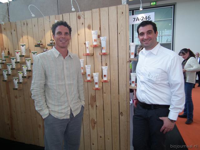 Op de Vivaness ook diverse Nederlandse exposanten. Op deze foto Alexander Dikkes (rechts) van Esse Organic Skincare. Links Trevor Steyn, de eigenaar van het Zuid-Afrikaanse biologische huidverzorgingslijn. Tussen hen in de nieuwe range 'Africa Organics'.