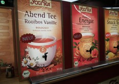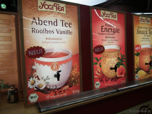 De nieuwe varianten Yogi Tea. De rechter (Positive Energy Cranberry & Hibiscus) heeft een Best New Product Award gewonnen.