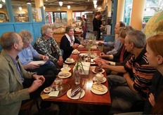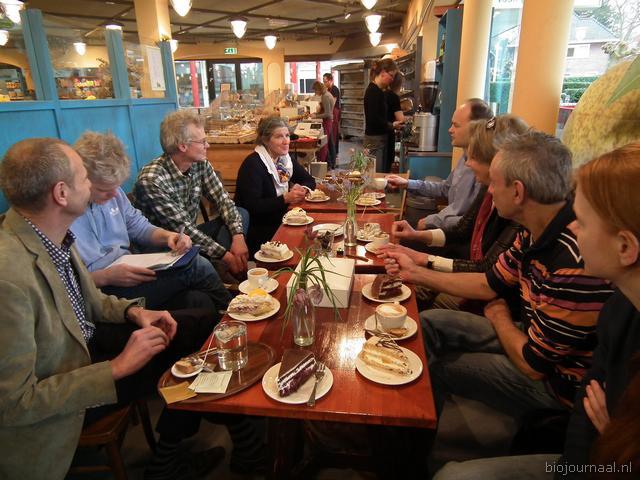 Koffie en gebak voorafgaand aan de overhandiging. Van links naar rechts Jan Willem Erisman (Louis Bolk Instituut), Jos van Duinen, Rudy Gerding, Astrid Weidmann, Jasper Vink (Bionext), Machteld Huber (Louis Bolk Instituut), Mike de Looze en Lara van Bree (beiden van ICEM, organisator BioVak).