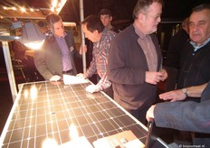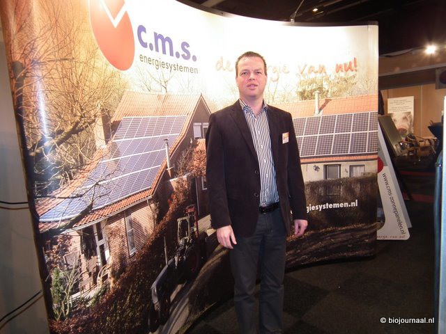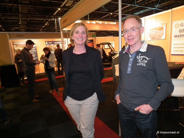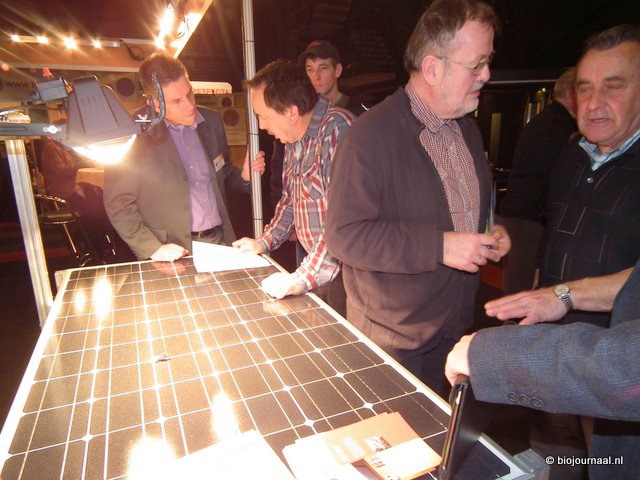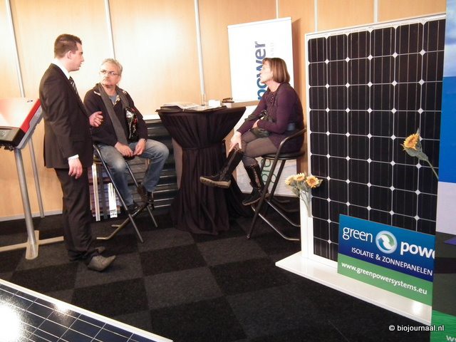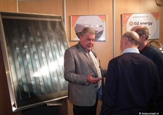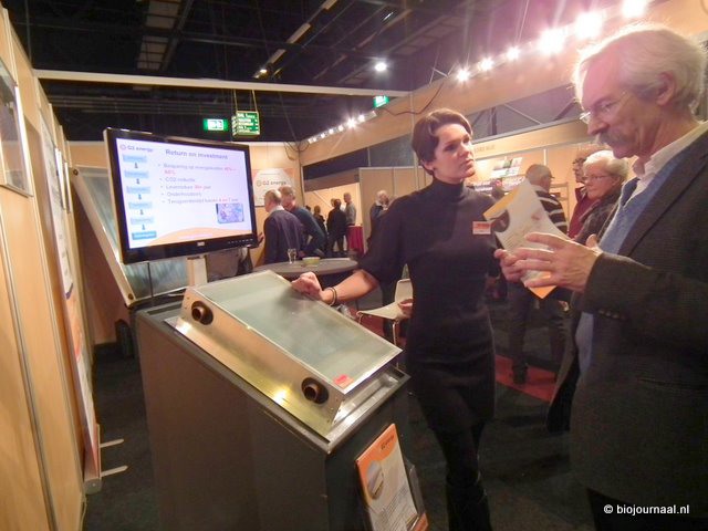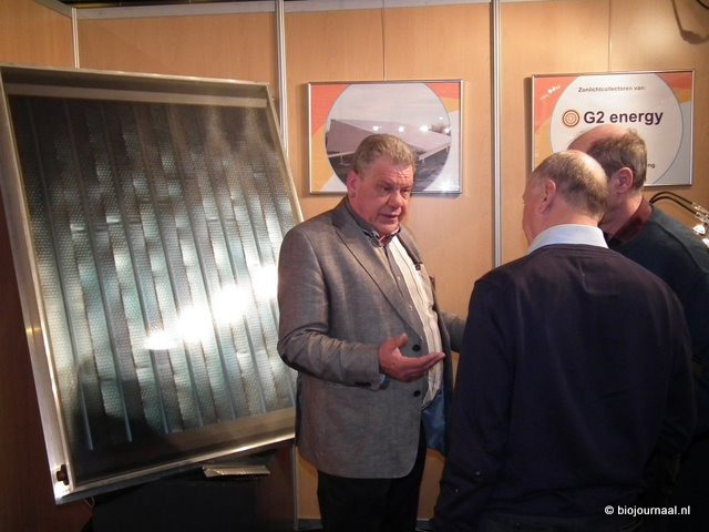"Hedwig van der Meulen geeft uitleg over de thermische zonnecollectoren van G2 Energy. Hiermee kunnen bio-boeren bijvoorbeeld voer verwarmen of warm water verkrijgen waarmee apparatuur schoongemaakt kan worden. "We willen tijdens deze beurs bekijken wat we voor de bio-branche kunnen betekenen."