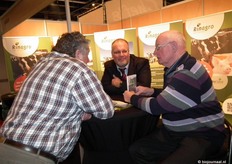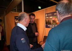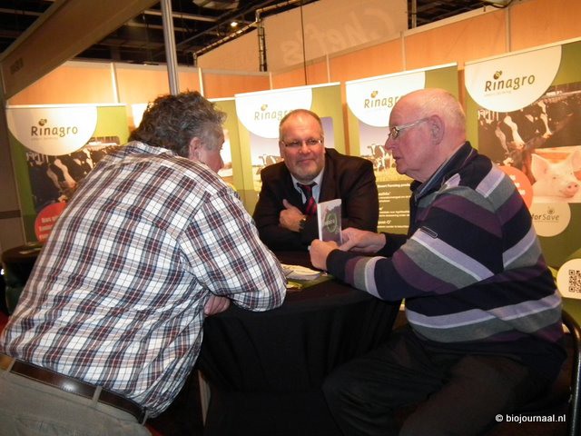 "Carel Heebink (met stropdas) van Rinagro druk in gesprek. "Het belangrijkste wat op deze beurs aandacht kreeg is dat je kunt composteren met behoud van energie door Compost-O van Rinagro toe te voegen aan het composterende materiaal. Hiermee verminder je ook de uitstoot van methaan. En drijfmest kan de bodem wel verbeteren als je onze AgriMestMix toevoegt."