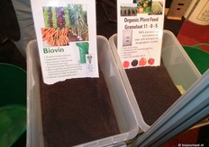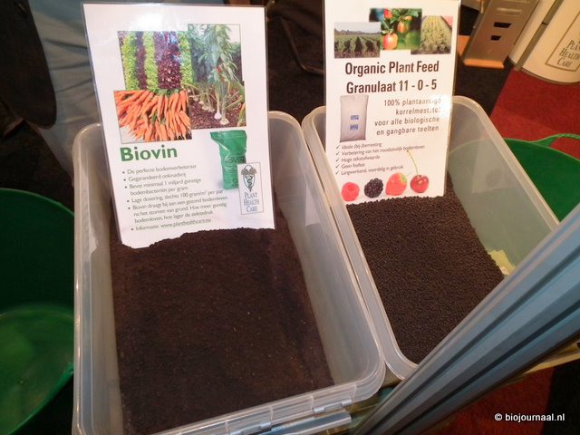 "Links Biovin. "Dit is een heel hoogwaardig compost dat bijdraagt aan een rijk bodemleven. Rechts een biologische plantaardige meststof van Plant Health Care. "Wij zijn een vertrouwd adres voor velen binnen de bio-branche. Het bio-aandeel van Plant Health Care ligt inmiddels op 30%."