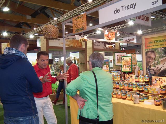 Wim Roeleveld mocht uiteraard niet ontbreken bij de stand van De Traay. Hier geeft hij uitleg over de nieuwe honingproducten aan één van de winkeliers.