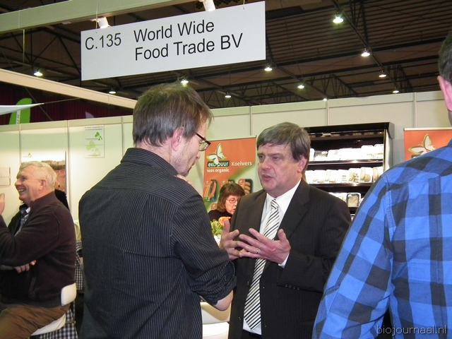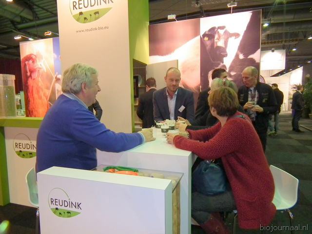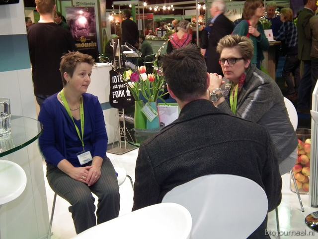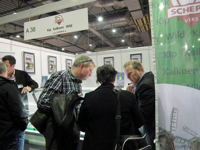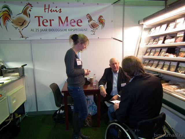 Genoeg te bespreken in de combi-stand van World Wide Food Trade, leveranciersvereniging Biomeerwaardekip en de Biologische Pluimveehouders Vereniging.