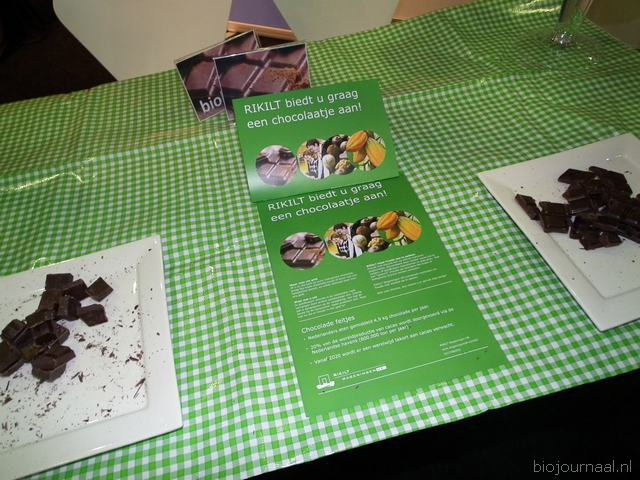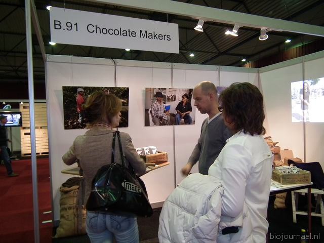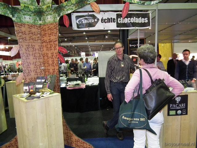 Jeroen Kruft met chocolade van Amigos International in de stand van De Nieuwe Band. Zoals elk jaar gaf De Nieuwe Band diverse vaste leveranciers de kans om hun producten in de stand te presenteren.