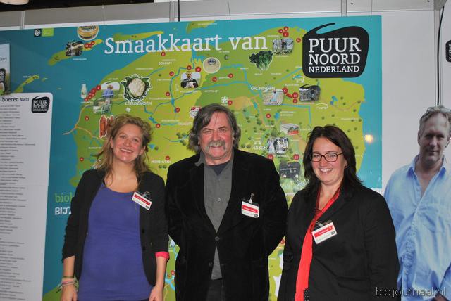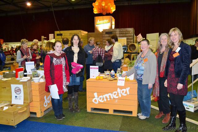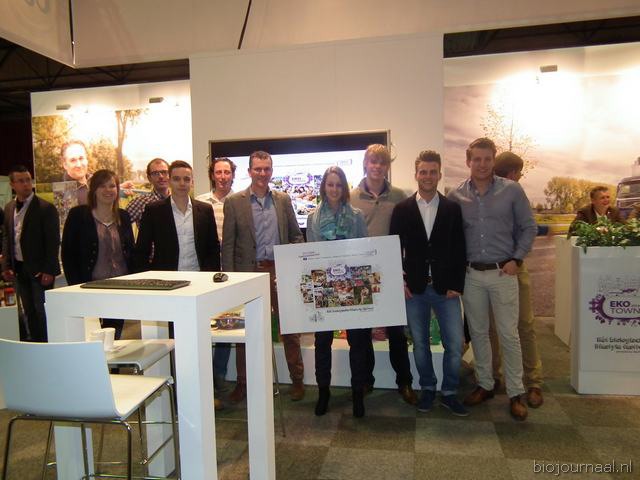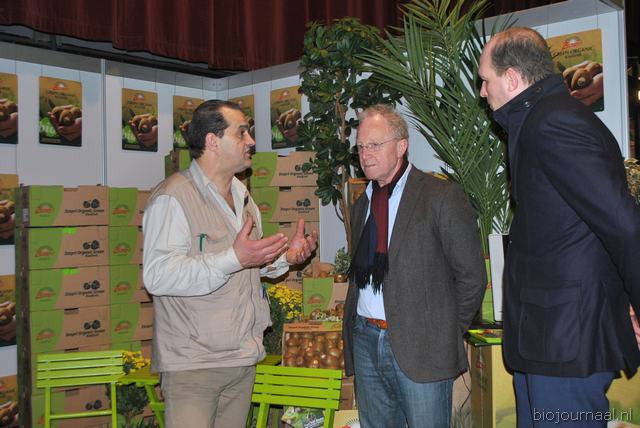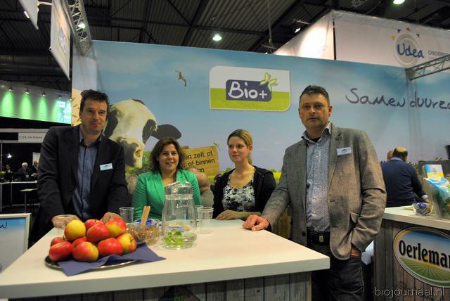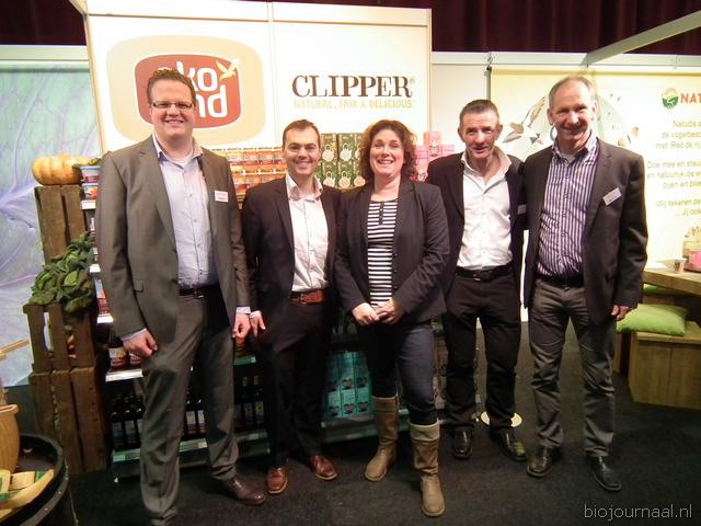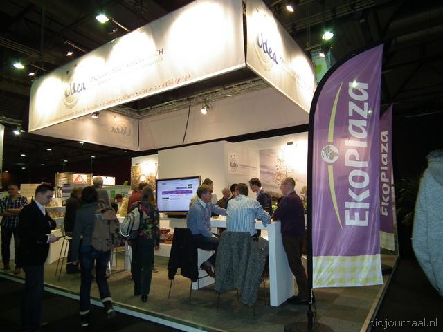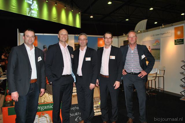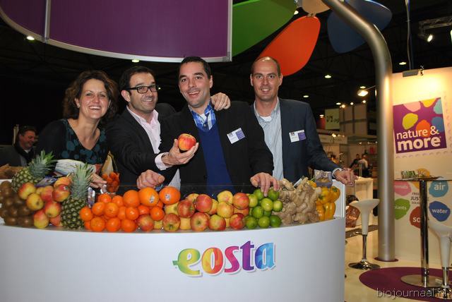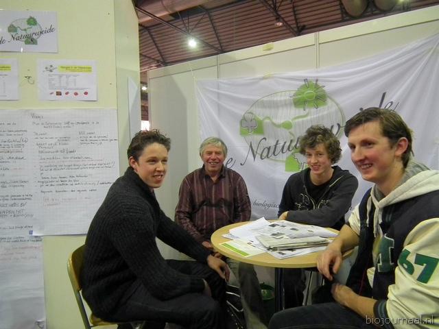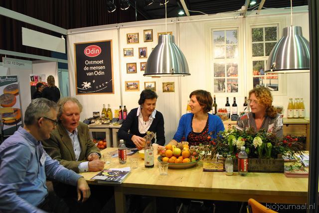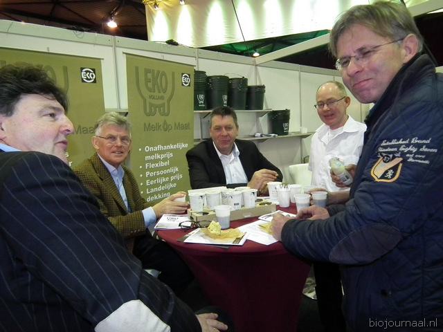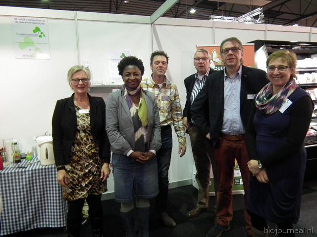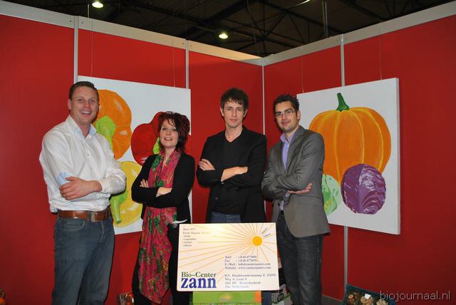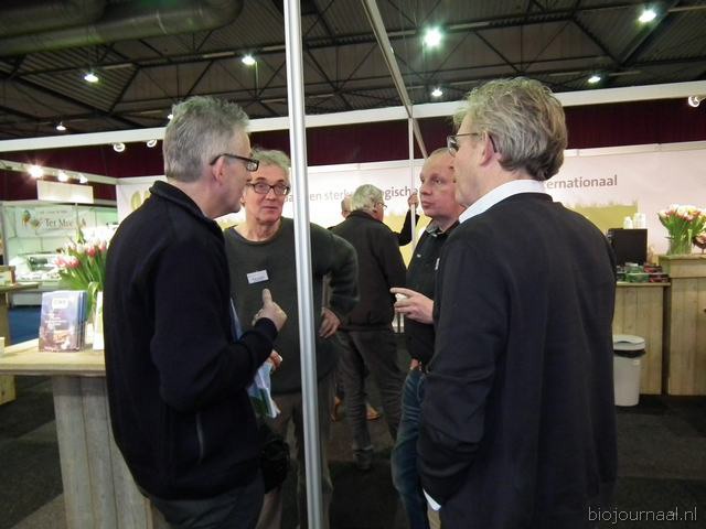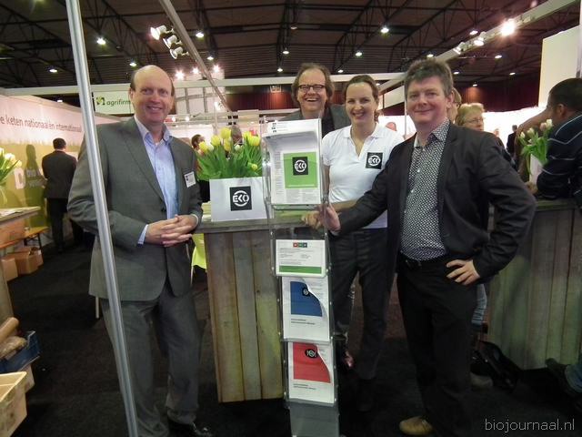 Ruime vertegenwoordiging van Stichting EKO-keurmerk: André Brouwer, Ronald van Marlen, Mariken de Bruijn en René Heusschen. Jan Knook van BioFlora verzorgde de bloemen in de combi-stand van Bionext.