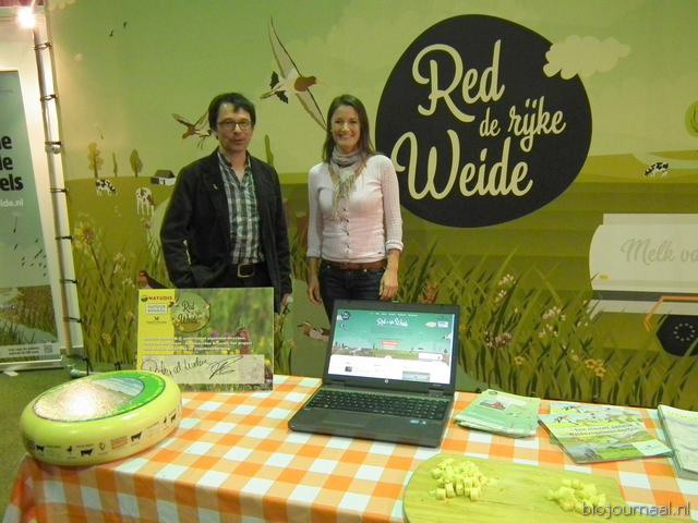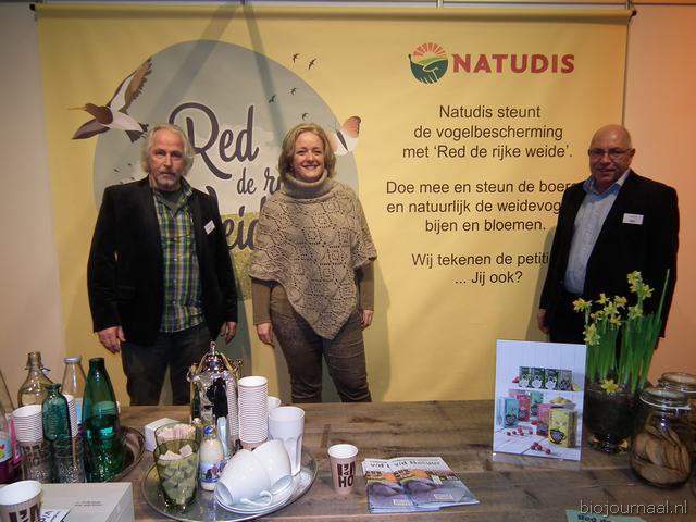 Paul Verweij, Petra van der Linden en Pieter Tent vragen in de stand van Natudis aandacht voor het project 'Red de rijke weide' van de Vogelbescherming.
