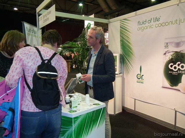Volop kokoswater van Dr. Martins te proeven in de stand van Spring Water Company. Marc Bod schenkt nog wat kokoswater in.