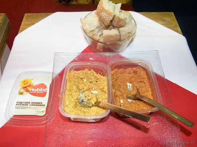 De nieuwe spreads van De Hobbit: pompoen-gember en Muhammara met rode paprika's, tofu en walnoten.