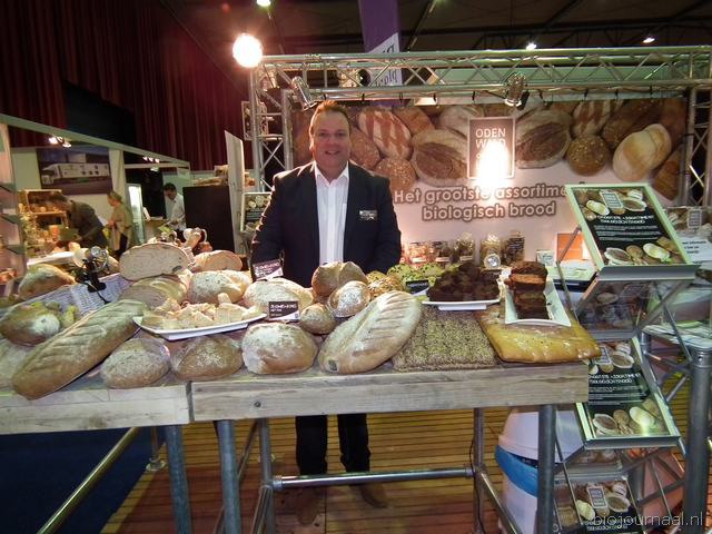 "Michael Fase met de bio-broden van Odenwald Organic Bakery. Nieuw is onder meer de tafelbol. Dit is bol van 200 of 400 gram die je klanten in de horeca zelf aan tafel kunt laten snijden. "Dat is echt de nieuwe trend, klanten willen zelf actief bezig zijn aan tafel."
