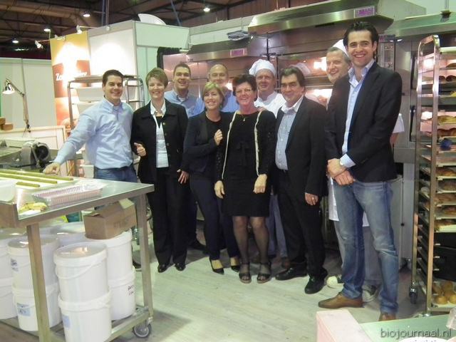 "Het beursteam van Bakkerij Van der Westen - Zonnemaire. Gerrie van der Westen (derde van links) gaf aan dat Freekie een aparte vermelding verdient. Bij deze: "Met 'ie' achter zijn naam past Freek Jacobs perfect in onze bakkersfamilie."