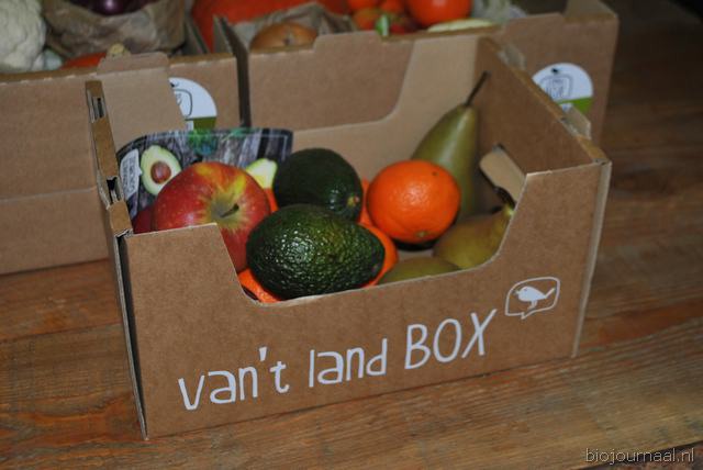 Op de stand van De Zaai-ster, de van't land box: Wekelijks een nieuw pakket biologische groenten of fruit, met een recept en het verhaal van de teler en van het land.