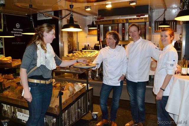 Jochem Keune biedt een bezoeker lekkers aan van Le Perron. Naast hem zijn collega's Olaf en Judith Heinen