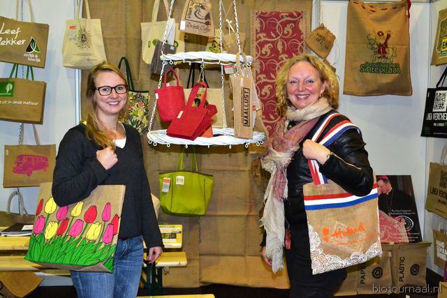 Aukje Prinsen en Desirée Rasenberg van Pure Jute. Desirée 'showt' de Holland Promotion tas