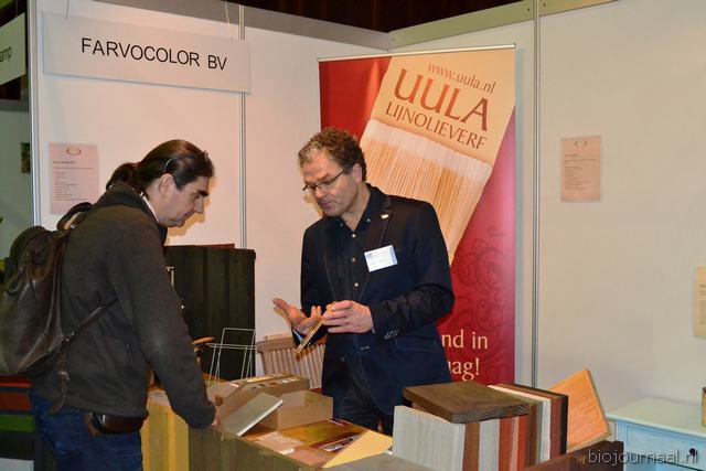 Wygor Smits in gesprek met een bezoeker. Farvocolor is importeur van ecologische verf op natuurlijke basis