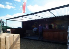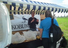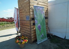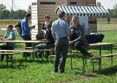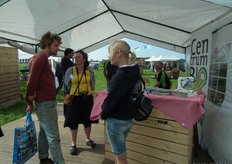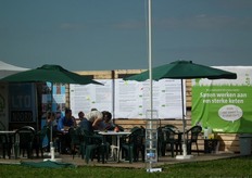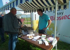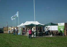De kraam van AgriConnection B.V. Rechts (geruit overhemd) Maarten Vrensen van Vitalis Biologische Zaden.
