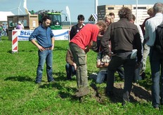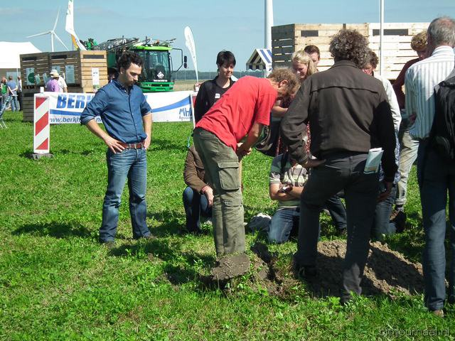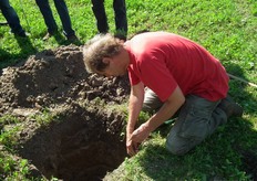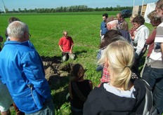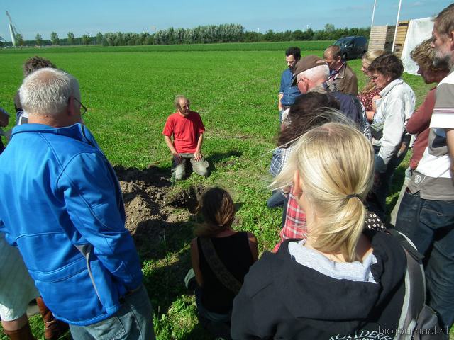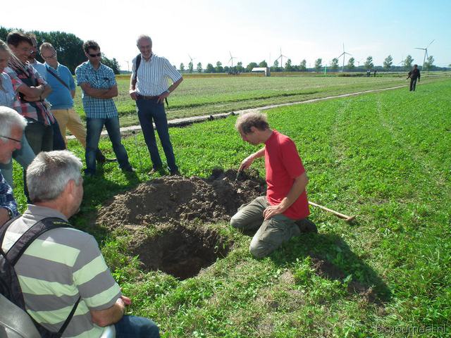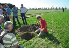 Hij liet de geïnteresseerden in deze kuil precies zien waar ze een gezonde bodem aan kunnen herkennen.