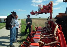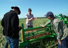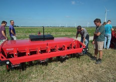 Ton Kramer (midden) legt de werking van de zaaimachine uit.