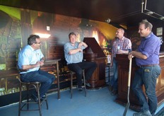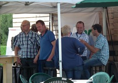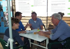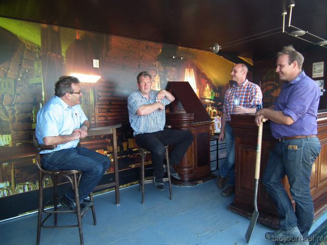 Helemaal rechts Jan Jaap Jantjes, de voorzitter van Biohuis. Links daarnaast Arend Zeelenberg (ketenmanager plantaardige sectoren). De mannen zijn in gesprek met Maria Buitenkamp (secretaris van Biohuis, op de rug gezien).