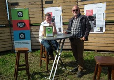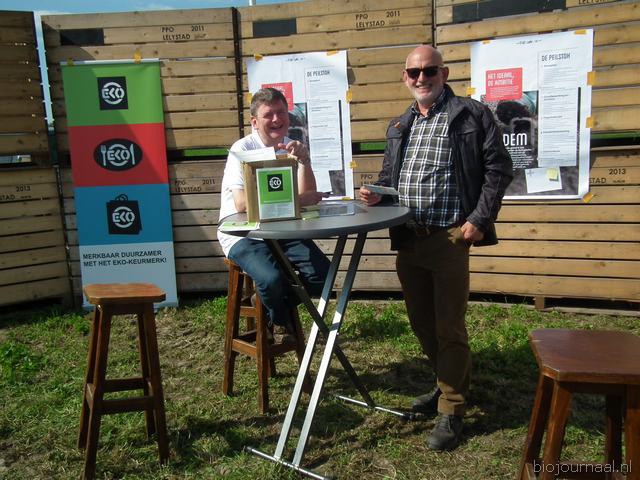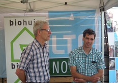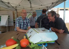 Bij René Heusschen konden bezoekers terecht voor meer informatie over Stichting EKO-keurmerk. Hier in gesprek met Ibo Atzema van West Plant Limburg.