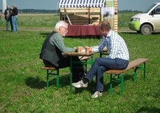 Bert van Ruitenbeek (Stichting Demeter), links, laat zich hierover informeren door Kees Bus (rechts).
