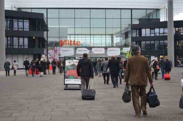 Een stroom bezoekers loop naar de ingang van BIOFACH 2015.