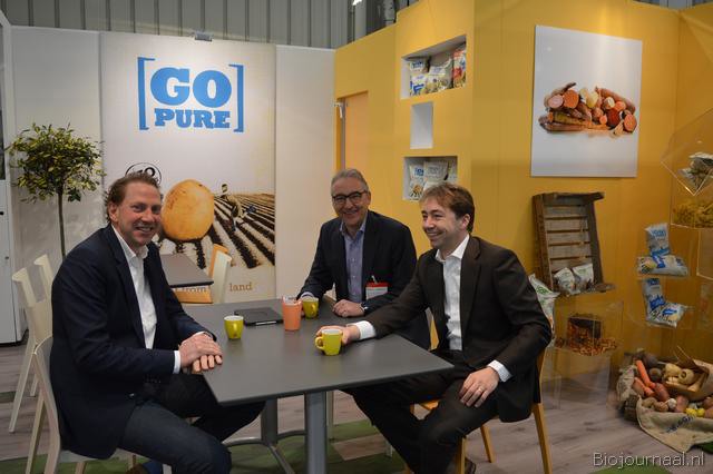 Pascal Camps van Camps Food in gesprek met de mannen van Yellow Chips: Vincent van Gorkom en Jesse 't Lam. Achterin de stand het nieuwe beeld van Go Pure, met het aardappelmeisje met de blauwe laarzen.