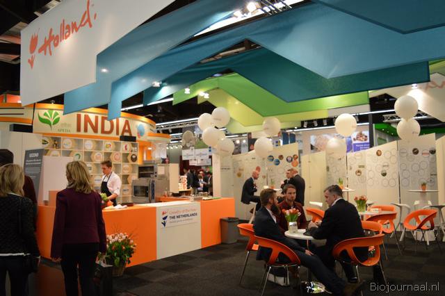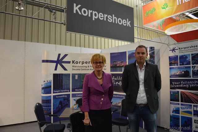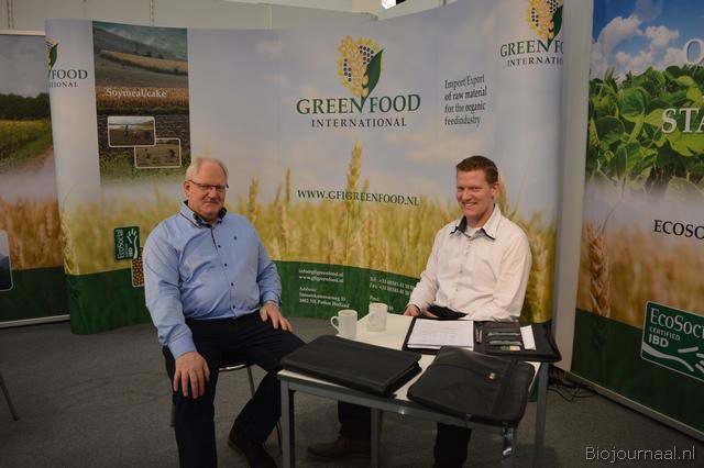 "Aalt en Martijn van de Kraats in de stand van Greenfood International (GFI). Aalt: "We krijgen het erg druk tijdens de beurs. Zo hebben we gedurende 3,5 dag om het uur een afspraak staan." Hij gaf ook aan dat GFI in 2014 met 10% gegroeid is."
