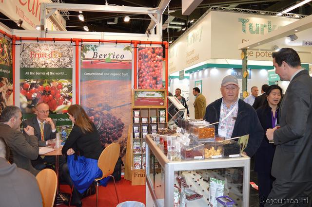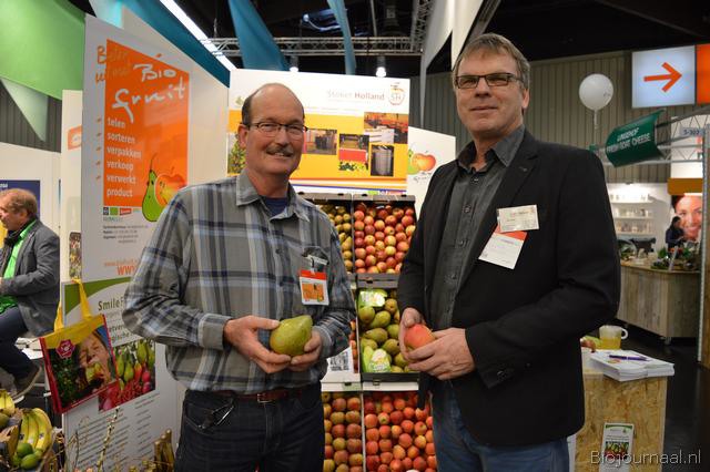 "Harmen Peters en Wim Stoker in de stand van Biofruit/Smilefruit. Harmen: "Het draait in onze stand echt om het product. We hebben ook nieuwe posters laten maken."